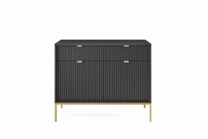 Komoda Livaro KSZ104 czarna 104 cm ze złotym stelażem to nowoczesny mebel w stylu glamour i loft, który wyróżnia się dekoracyjnymi ryflowanymi frontami. Połączenie głębokiej czerni ze złotą metalową podstawą nadaje bryle elegancki charakter i sprawia, że komoda staje się stylowym elementem aranżacji wnętrza. Dzięki dwóm szufladom oraz półkom za drzwiami mebel oferuje wygodne miejsce do przechowywania w salonie, sypialni lub przedpokoju.