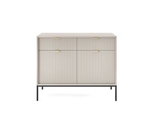 Komoda Livaro KSZ104 kaszmir 104 cm z czarnym stelażem to nowoczesny mebel w stylu loft i glamour, który wyróżnia się eleganckimi ryflowanymi frontami. Subtelny kolor kaszmir w połączeniu z czarną metalową podstawą nadaje komodzie stylowy charakter i sprawia, że doskonale pasuje do nowoczesnych aranżacji wnętrz. Dzięki dwóm szufladom oraz półkom za drzwiami mebel zapewnia wygodne miejsce do przechowywania w salonie, sypialni lub przedpokoju.