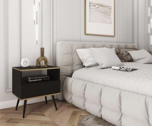 Elegancka szafka nocna ORO S-54 z czarnym korpusem i ryflowanym frontem to stylowy stolik nocny do nowoczesnej sypialni. Jedna szuflada, otwarta przestrzeń oraz czarne nogi łączą funkcjonalność z luksusowym wyglądem.