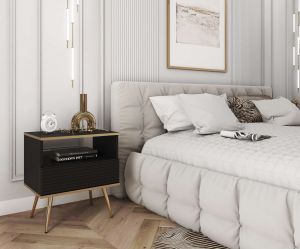 Elegancka szafka nocna ORO S-54 z czarnym korpusem i ryflowanym frontem to stylowy stolik nocny do nowoczesnej sypialni. Jedna szuflada, otwarta przestrzeń oraz złote nogi łączą funkcjonalność z luksusowym wyglądem.