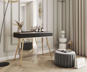 Elegancka toaletka ORO T-102 w kolorze czarnym z ryflowanymi frontami i złotymi nogami to nowoczesny mebel do sypialni lub salonu. Dwie pojemne szuflady z systemem push to open, matowe wykończenie oraz kontrastowe detale sprawiają, że doskonale sprawdzi się także jako sekretarzyk lub konsola.
