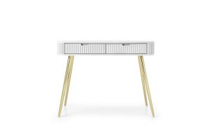 Toaletka biała ryflowana na złotych metalowych nogach to stylowy i funkcjonalny mebel do sypialni. Wyposażona w praktyczne szuflady, sprawdzi się również jako konsola lub sekretarzyk. Eleganckie ryflowanie i kontrastowe nogi nadają jej nowoczesny charakter.